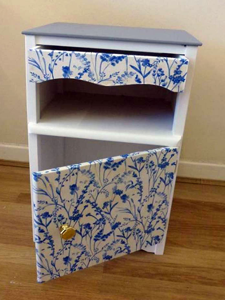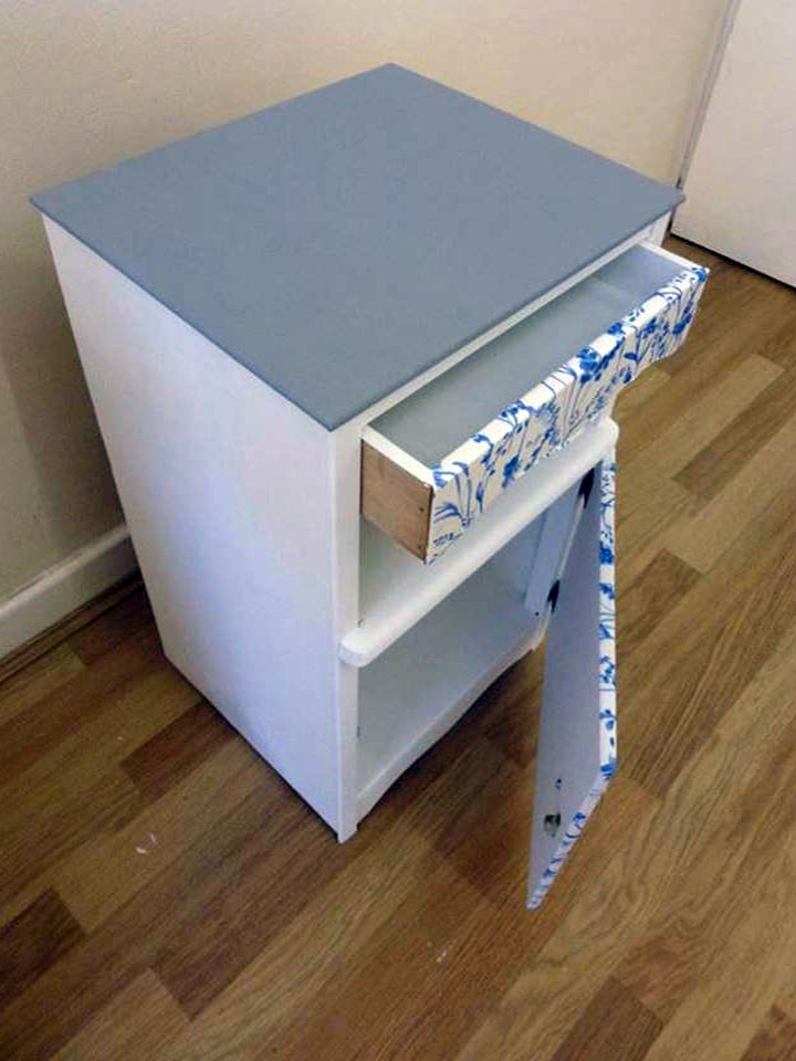 The blue floral bedroom cabinet is an up-cycled unity that has a storage area which features a door and a lined drawer. The drawer and door are featured with a blue floral pattern which makes this cabinet unique.