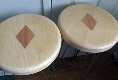 The set of 4 stools are made up of 2 hardwoods. Ash (the lighter of the 2) was formerly a bench that featured in the main corridor for 20 years in a School I once worked at. It was being removed and I secured the material for my recycling. The darker wood is Iroko. This features as an inlay which gives the stools some originality. The legs are hair pin and they are bought from a local store