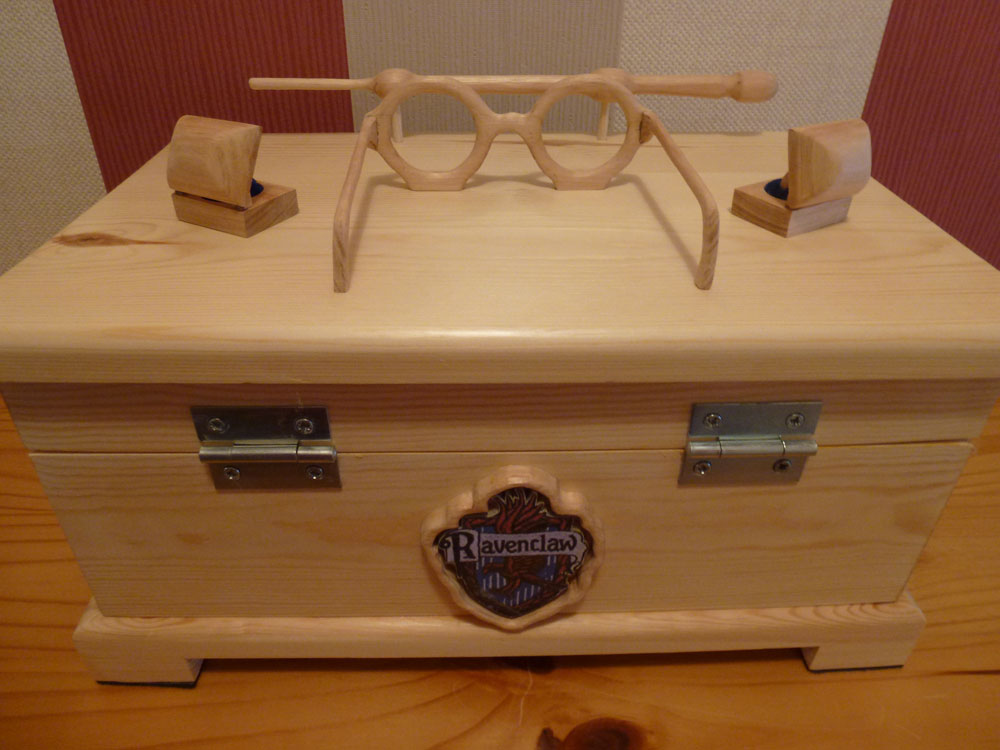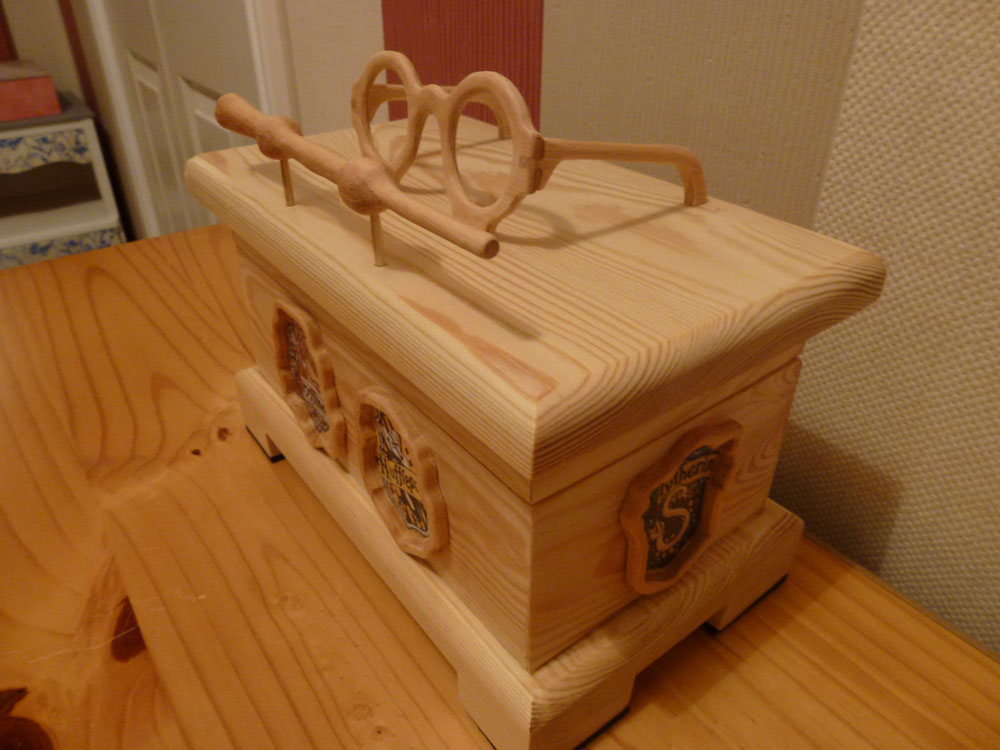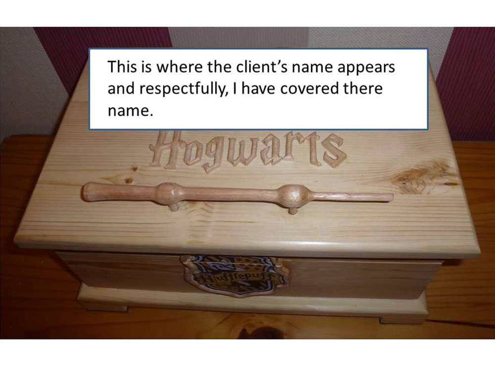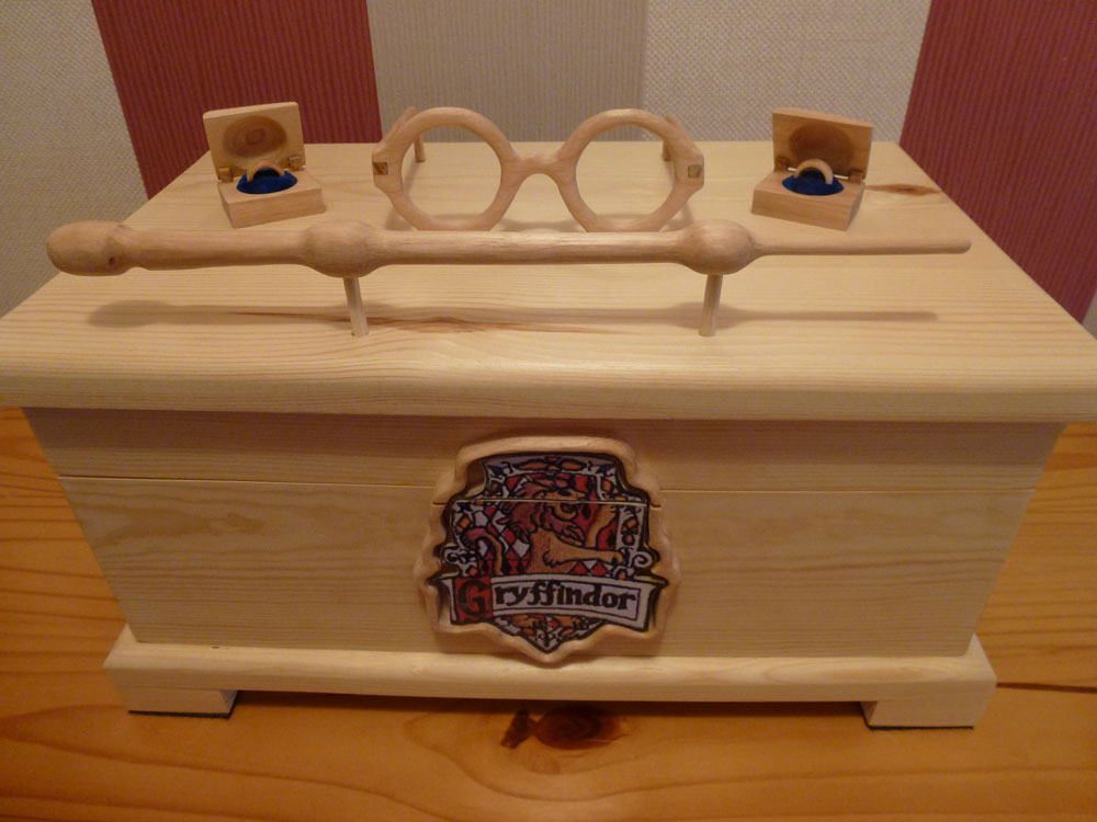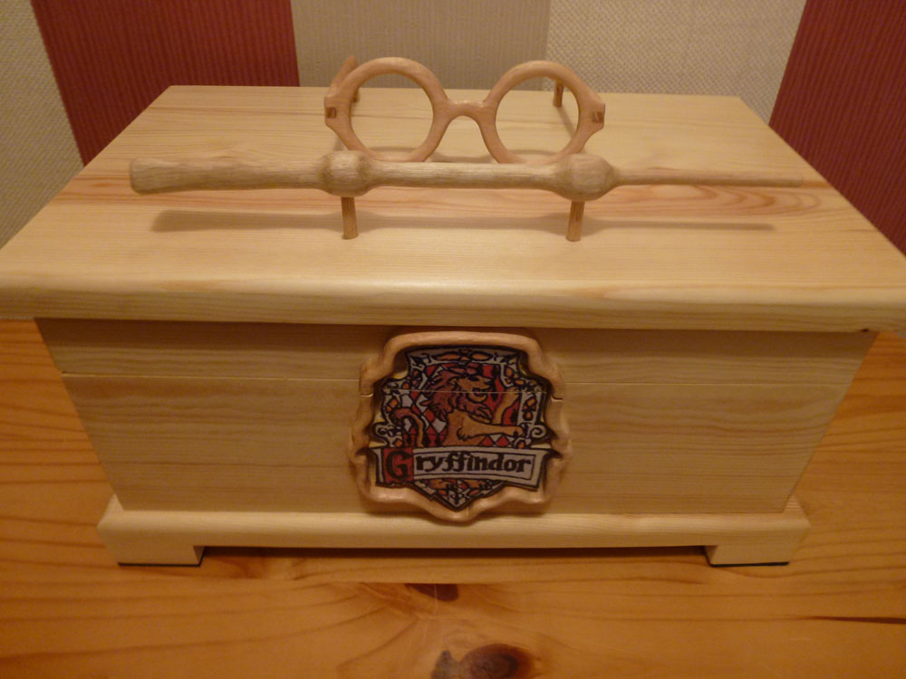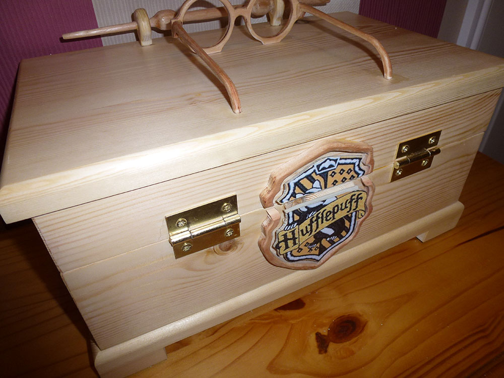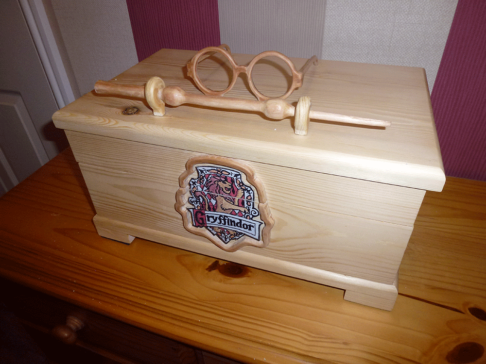 Sitting in Sainsbury’s car, I receive a phone from a young lady who would like a Wizard box for her daughter’s birthday. She was quite specific about the design requirements with the usual embellishments of the `Spectacles and wand`. The usual materials were used in this latest edition. The Harry Potter house badges were part of that specification with Gryffindor featuring on the front.