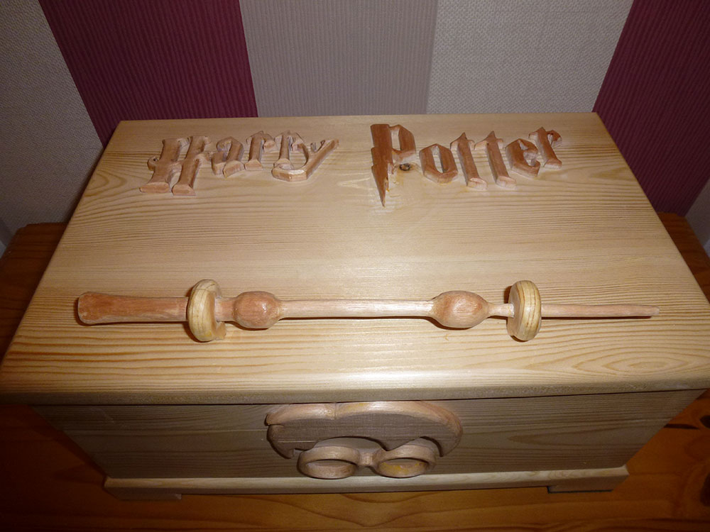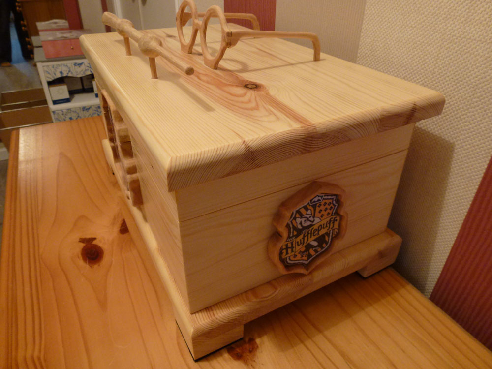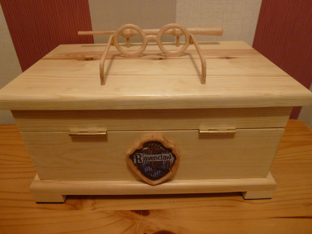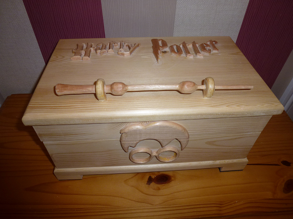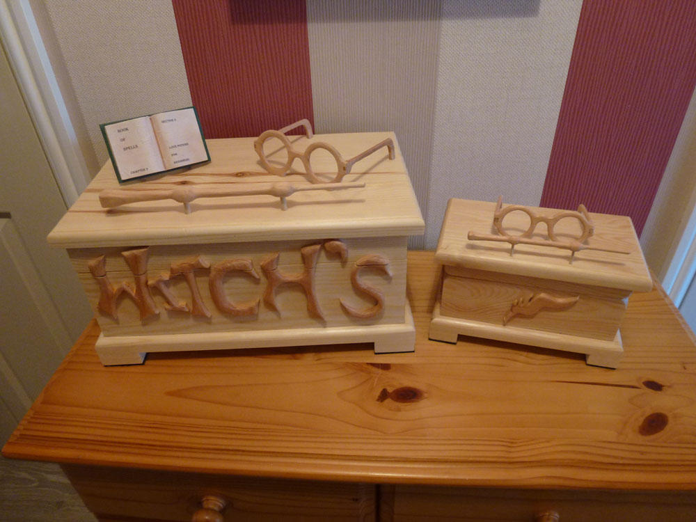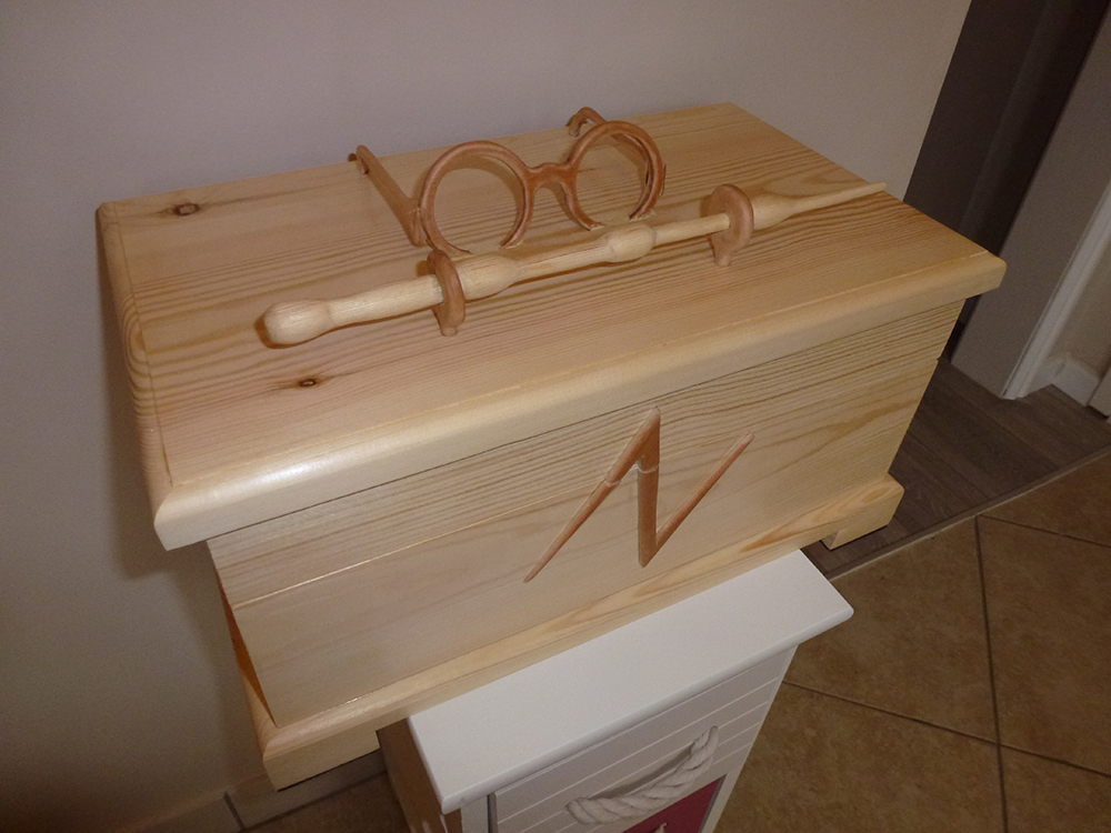 Sitting in Sainsbury’s car, I receive a phone from a young lady who would like a Wizard box for her daughter’s birthday. She was quite specific about the design requirements with the usual embellishments of the `Spectacles and wand`. The usual materials were used in this latest edition. The Harry Potter house badges were part of that specification with Gryffindor featuring on the front.