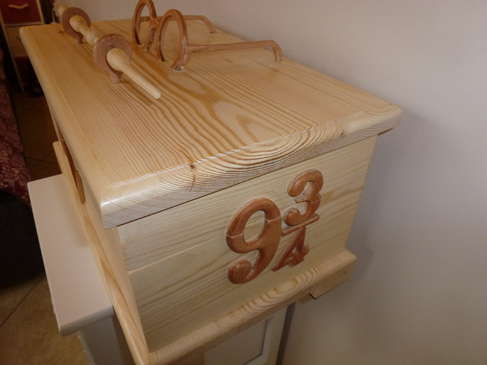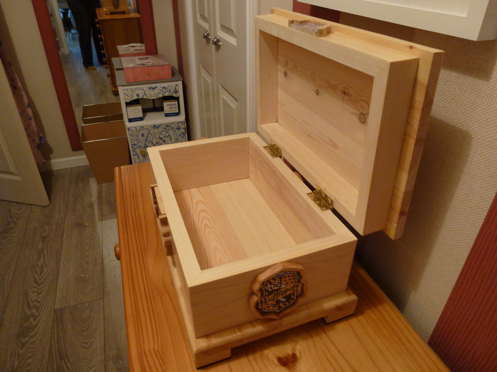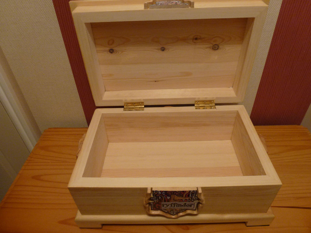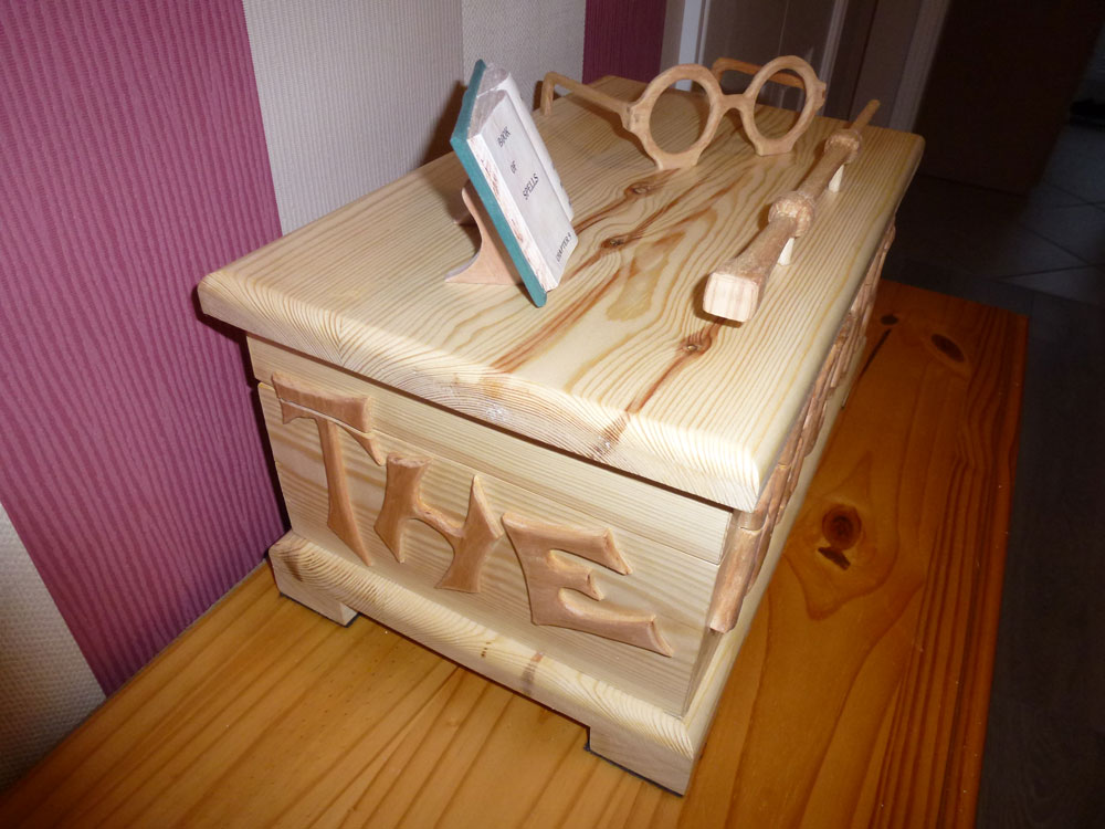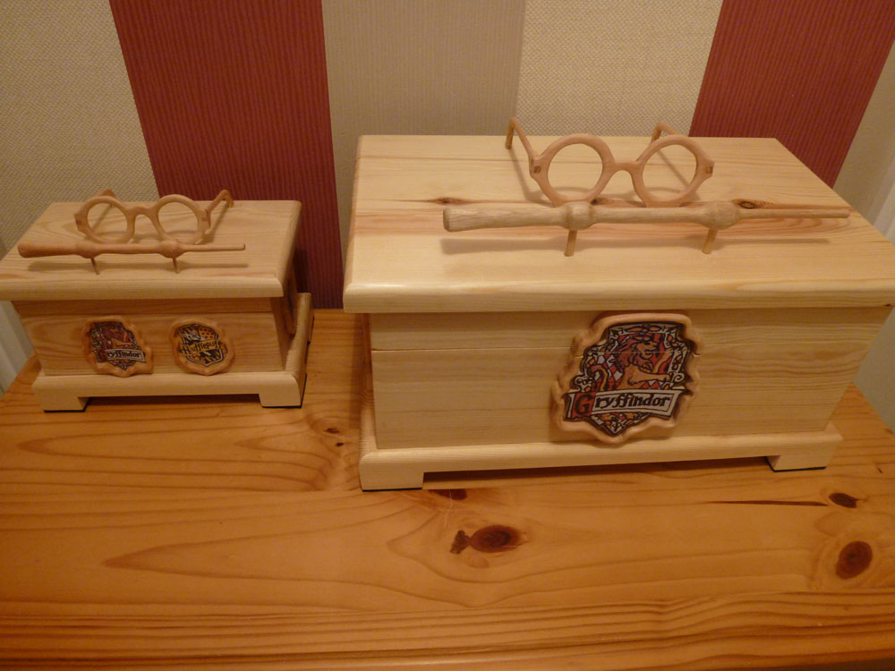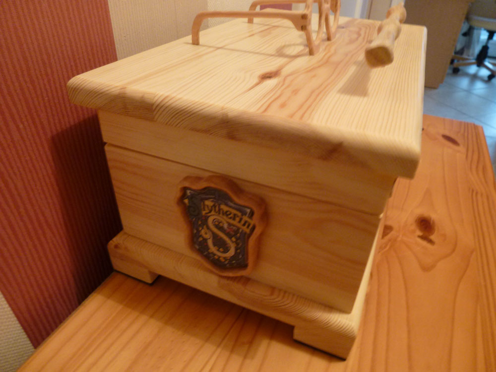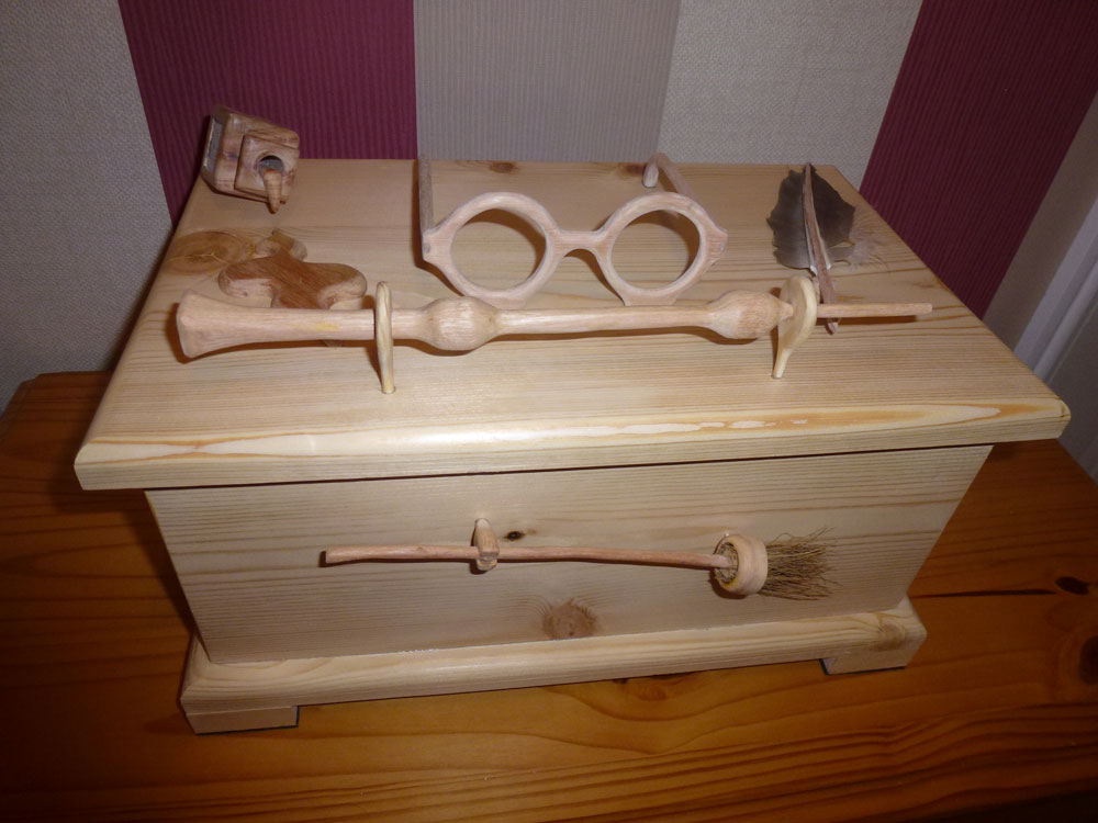 Sitting in Sainsbury’s car, I receive a phone from a young lady who would like a Wizard box for her daughter’s birthday. She was quite specific about the design requirements with the usual embellishments of the `Spectacles and wand`. The usual materials were used in this latest edition. The Harry Potter house badges were part of that specification with Gryffindor featuring on the front.