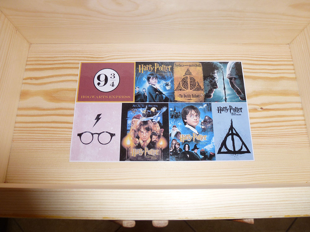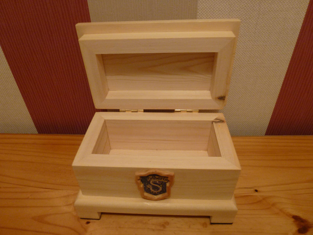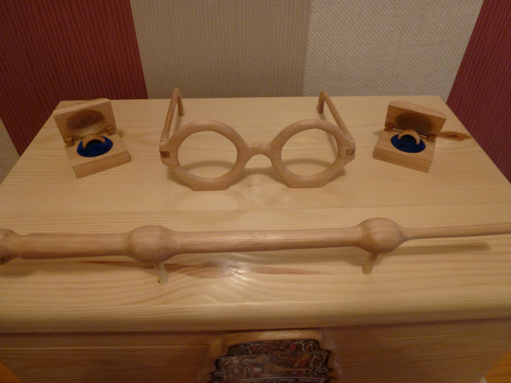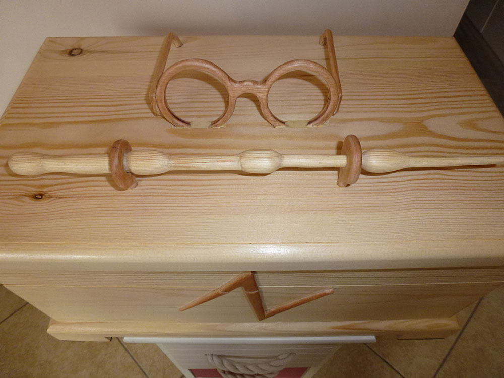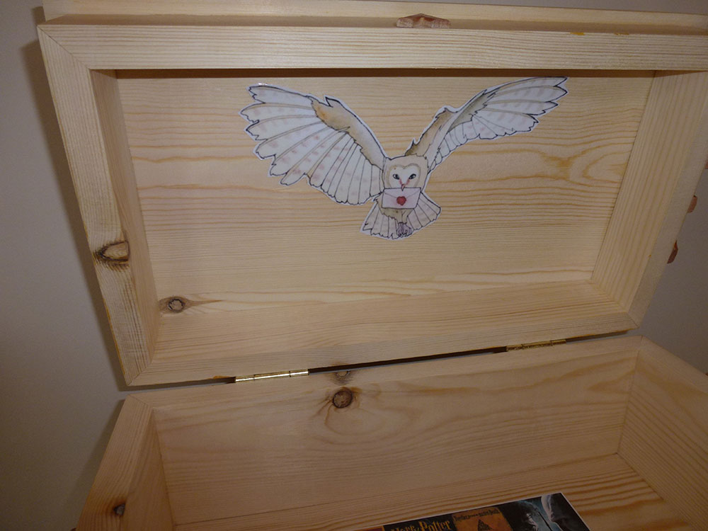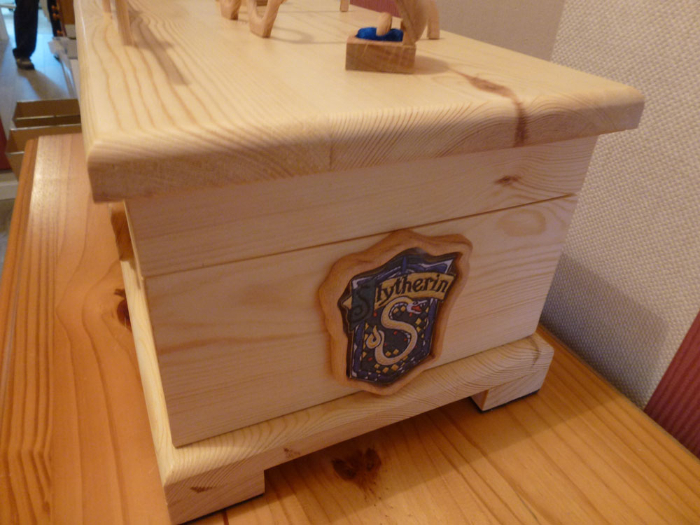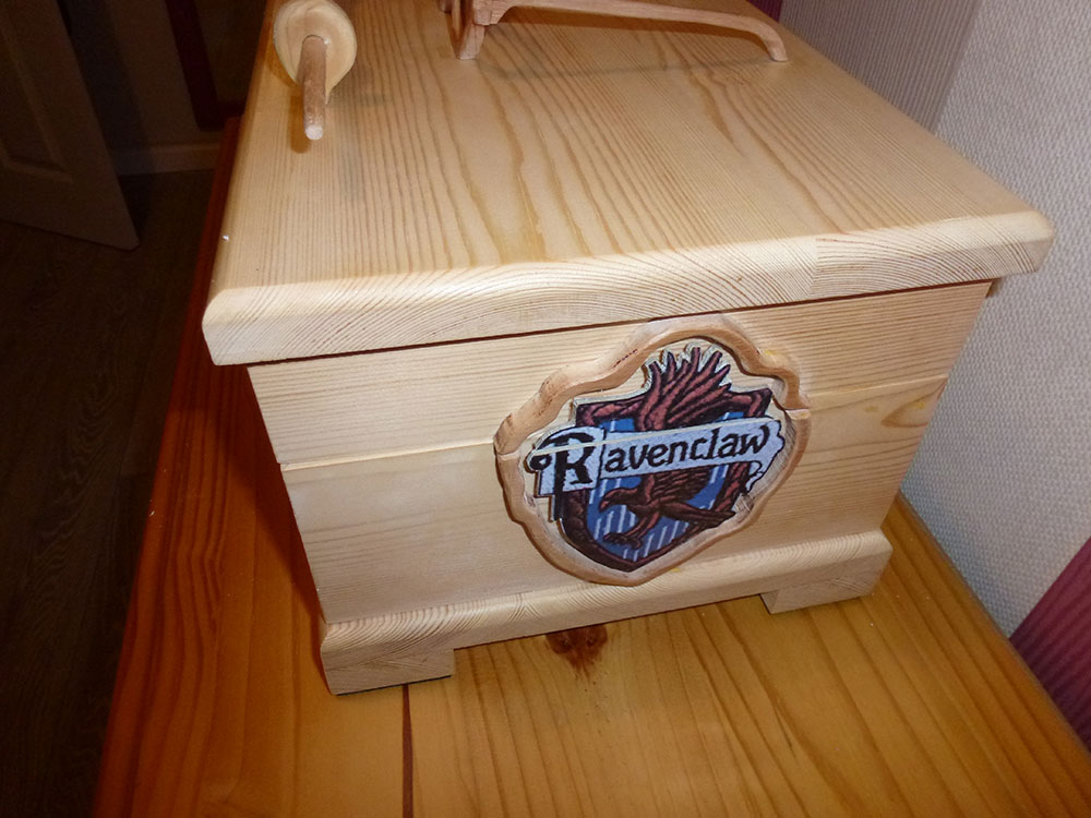 Sitting in Sainsbury’s car, I receive a phone from a young lady who would like a Wizard box for her daughter’s birthday. She was quite specific about the design requirements with the usual embellishments of the `Spectacles and wand`. The usual materials were used in this latest edition. The Harry Potter house badges were part of that specification with Gryffindor featuring on the front.