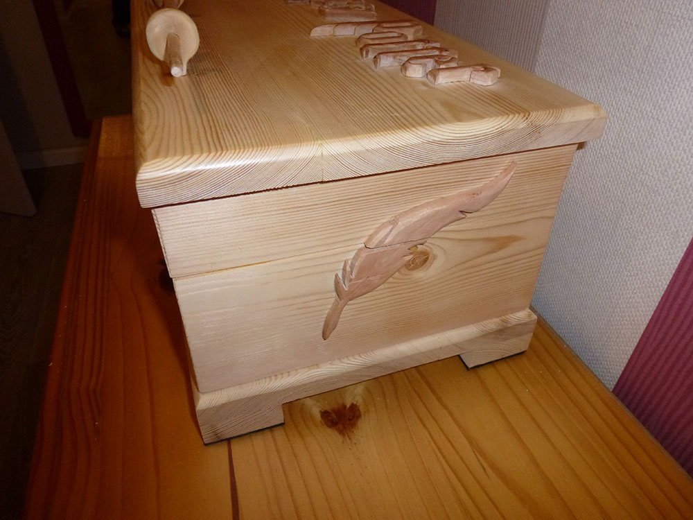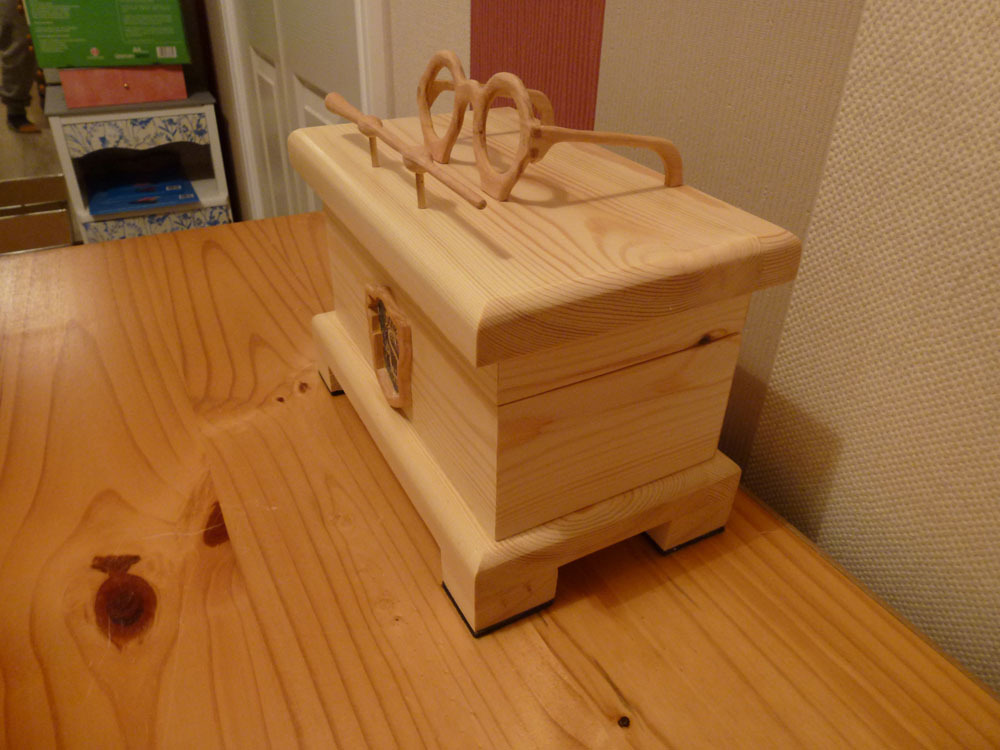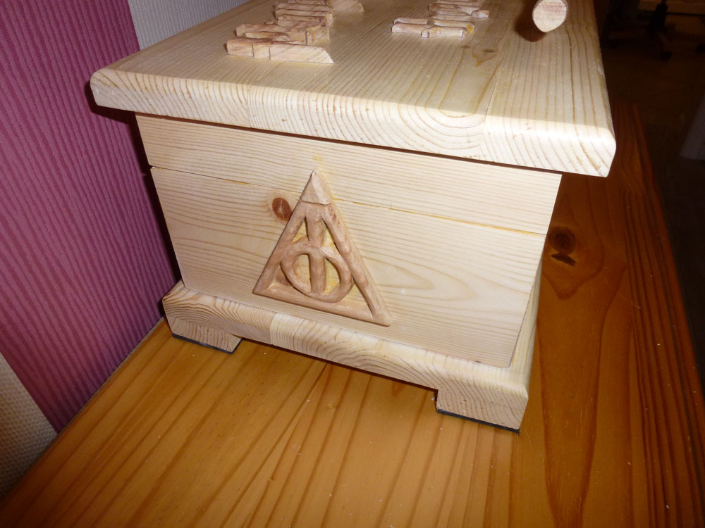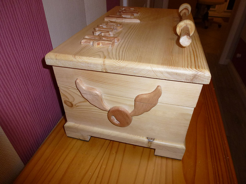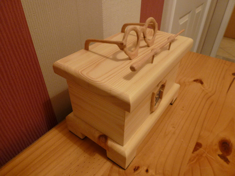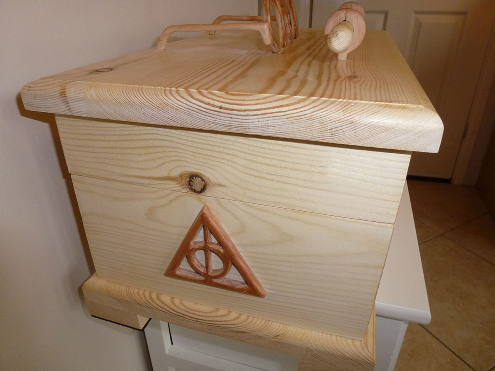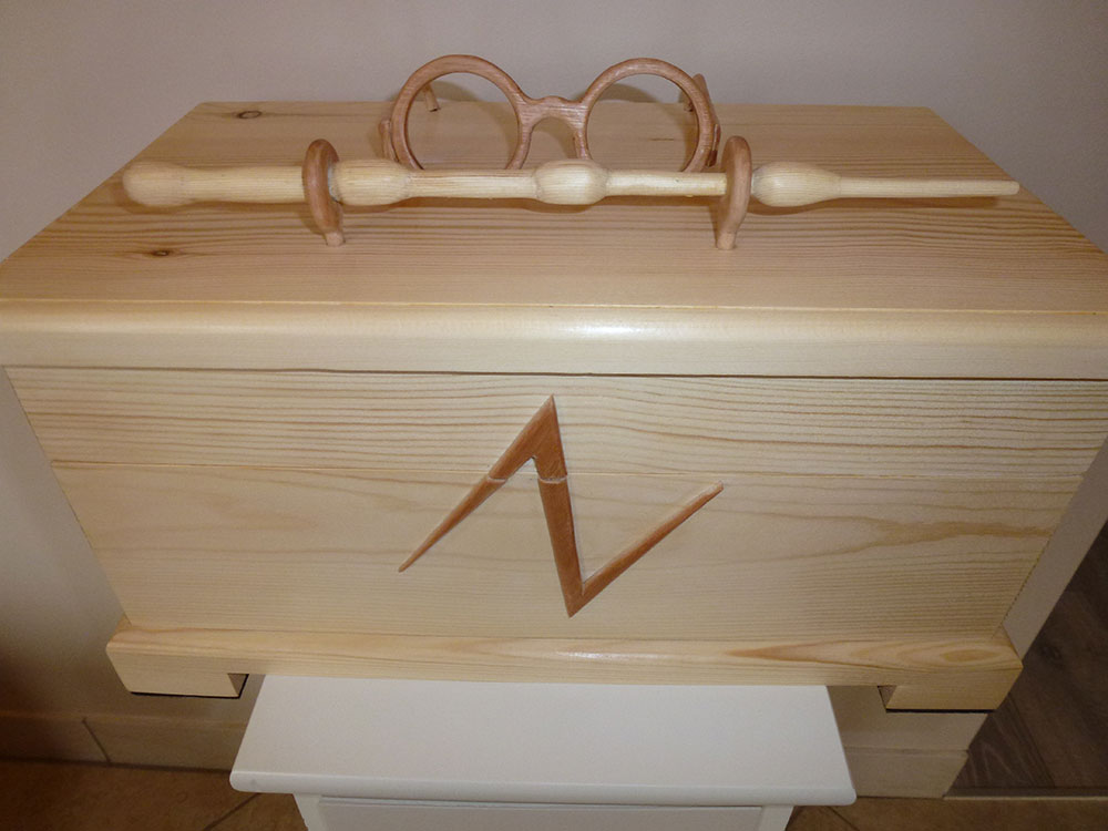 This Wizard Box was requested by a friend of long standing. It is for a birthday for a family member. This box is personalised and comes with an additional wand which features on the inside of the lid. As usual, the box is made from pine and the embellishments are hand crafted from Iroko.
