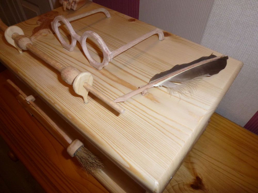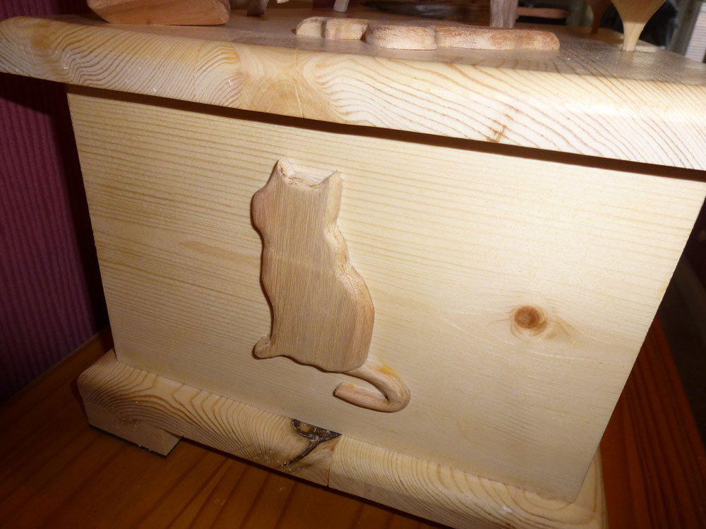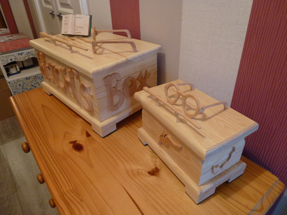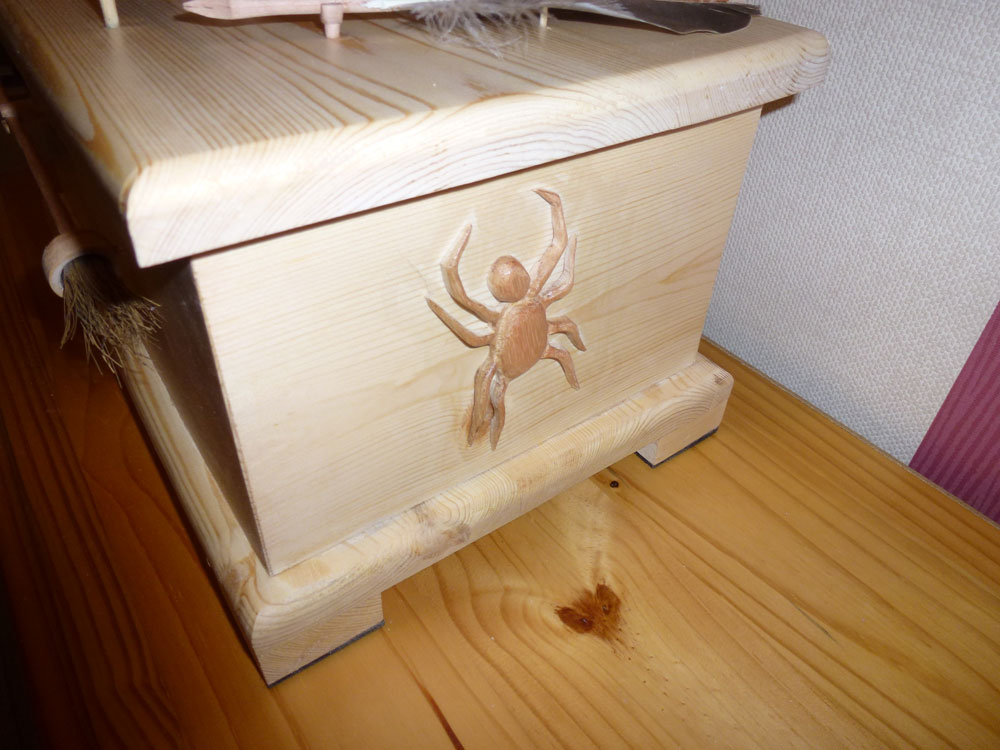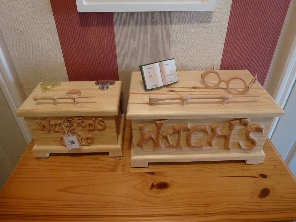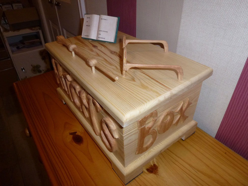 This Wizard box is designed to store memorabilia and trinkets of the Wizard. The box is made from pine, but the additional decorative items are made from a hardwood called Iroko. This my most challenging Wizard Box to date. The spilt ink bottle and quill, broom, spider and cat have all been crafted by hand.