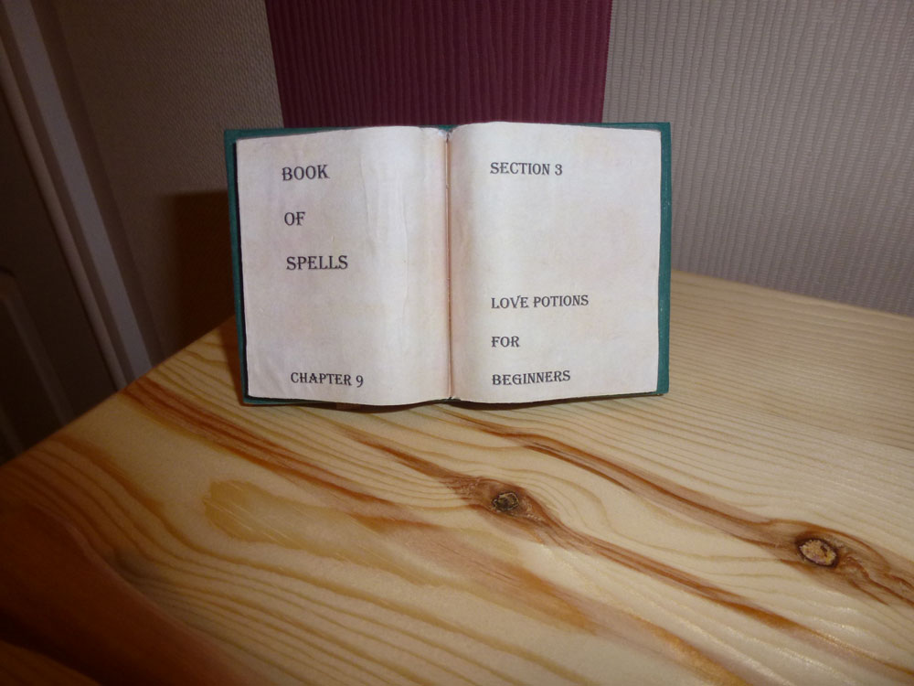 This box in the `Wizard` series of themed boxes concentrates on the witches spell book. This example features `The Love Potions for Beginners`. The book is made from hard wood (Iroko) as usual and then made to look authentic. The usual features are the wand and spectacles.