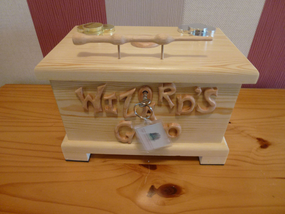 This small `Wizard Box` has only one embellishment on the front the box. This is a good way to reduce the cost of what you would like to pay for the box. The usual embellishments will serve as part of the basic design, which always be part of the `Wizard` box specification and they are the spectacles and the wand which feature on top of the box.